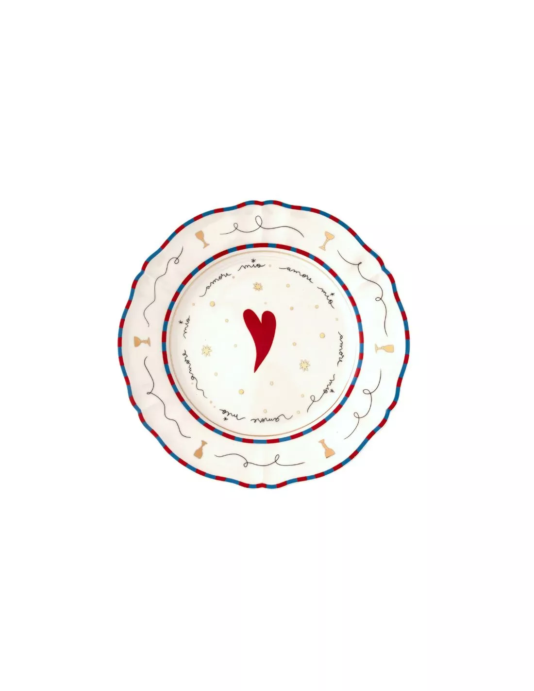 Assiette Ă dĂ®ner en porcelaine magnifique de la marque de design italienne Bitossi Home ornĂ©e d’un coeur rouge au centre, entourĂ©e de manière ludique par le texte ‘magic’ et d’un bord graphique dans deux nuances de rose.