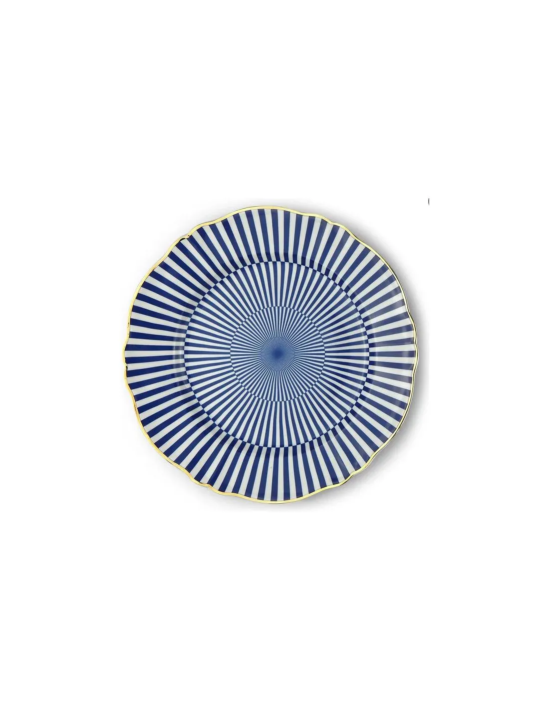 The Arcano design features a mesmerizing geometric starburst pattern in a deep midnight blue and crisp white contrast. At its heart lies a sunburst motif, surrounded by concentric layers of rhythmic triangles that create an optical illusion of movement. Each plate is meticulously finished with hand-painted gold accents along the rim and within the graphics, adding a luxurious ‘stardust’ sparkle to your dining experience.