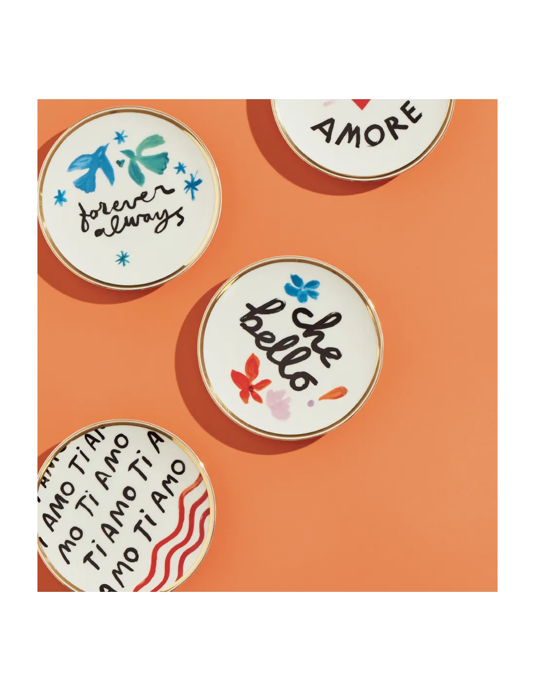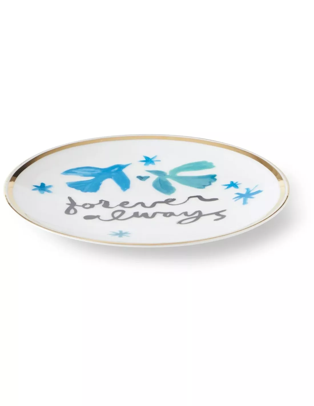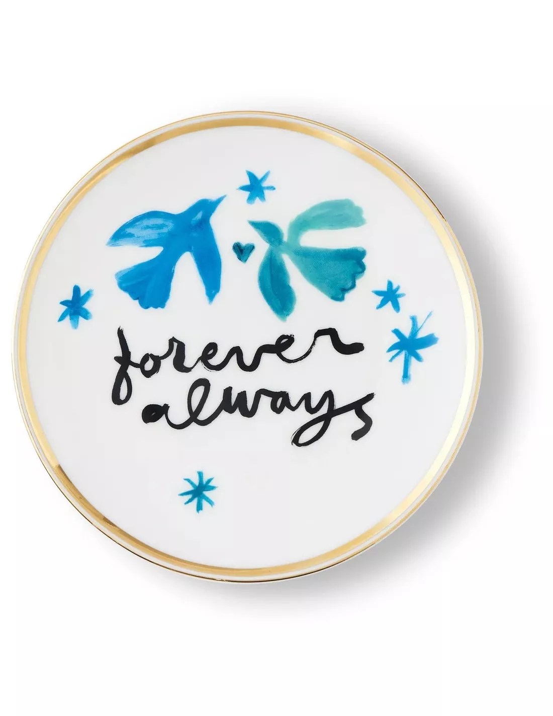 Cette pièce d’art de la table se distingue par son design graphique captivant : un cercle central d’un bleu profond accueille l’inscription noire « Forever Always », le tout souligné par un liseré délicat doré à la feuille d’or. Le contraste entre la porcelaine blanche et les finitions précieuses apporte une touche lumineuse et sophistiquée à votre service.