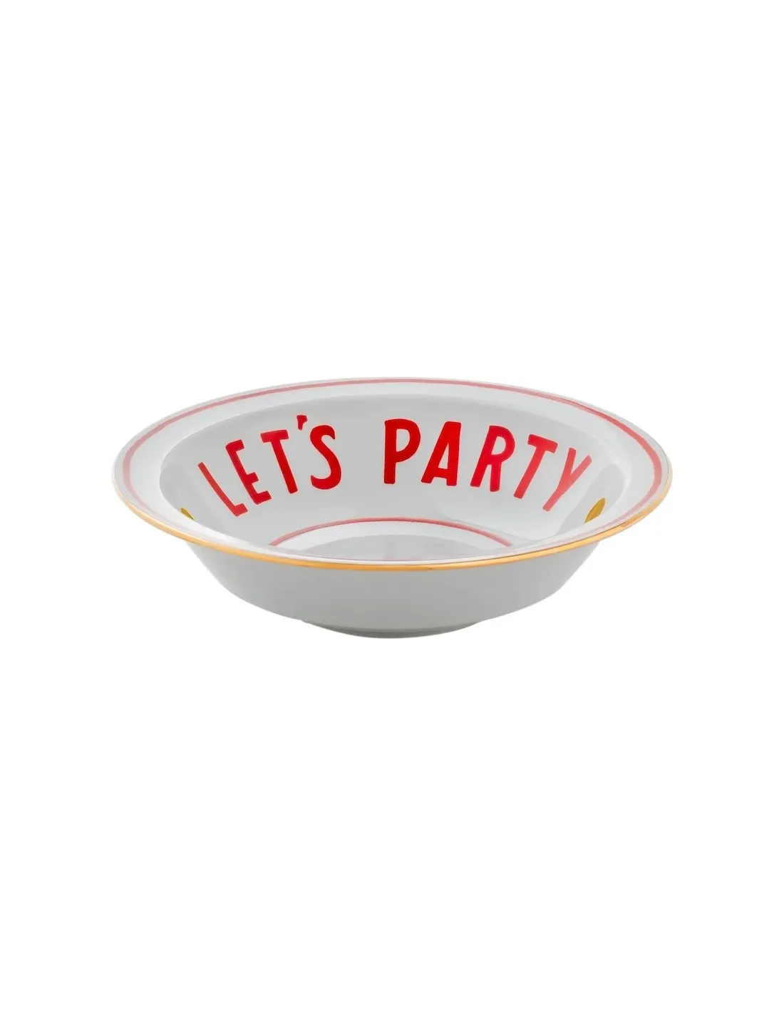 Ce modèle se distingue par sa finition en céramique blanche éclatante, contrastée par l’inscription audacieuse « Let’s Party » en rouge vibrant. Le design est sublimé par un liseré doré raffiné sur le bord, capturant parfaitement l’équilibre entre le luxe artisanal et la convivialité moderne.