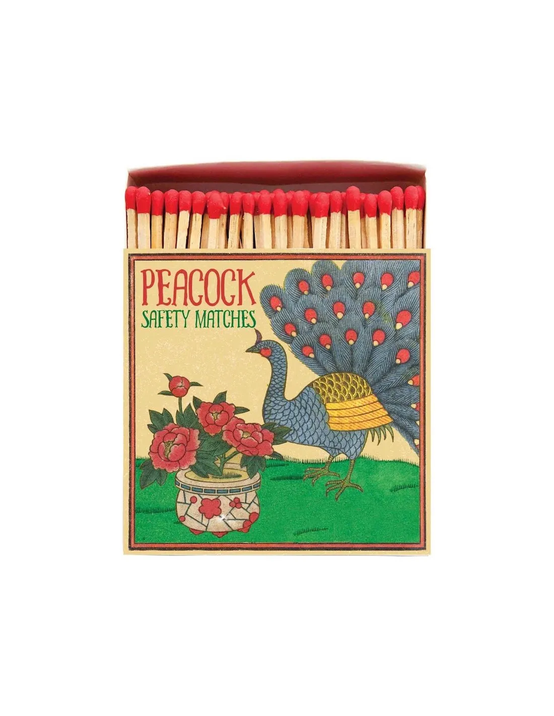 Cette boîte carrée de 11 cm arbore une illustration majestueuse de paon aux détails finement travaillés, inspirée des gravures vintage. Son format généreux permet de ranger des allumettes suffisamment longues pour atteindre le fond de vos photophores sans risque de brûlure.