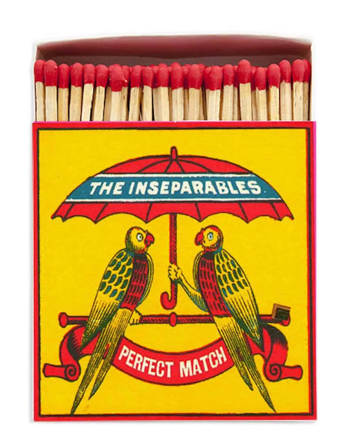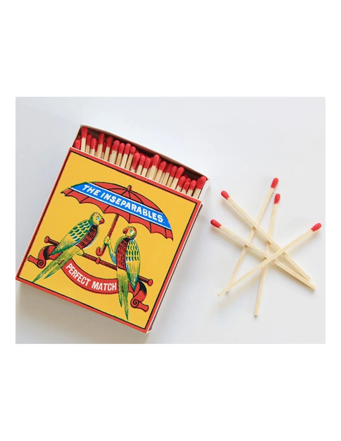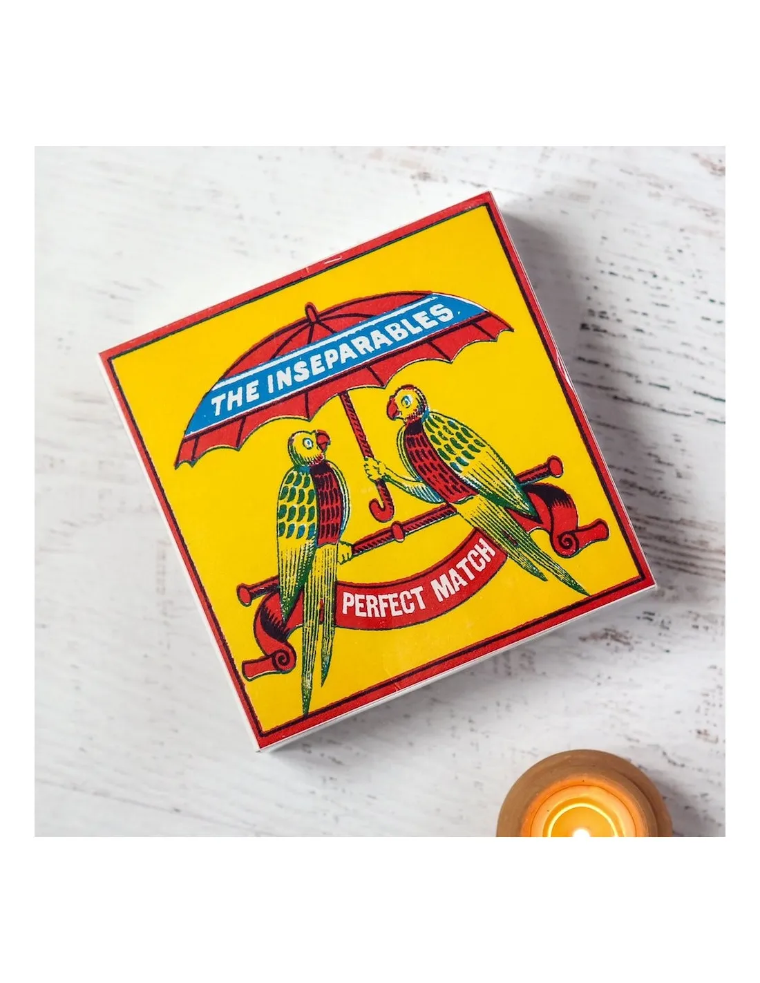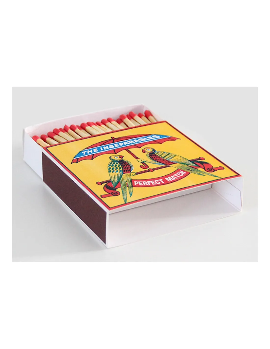 Apportez une touche artistique à votre intérieur avec cette boîte d’allumettes carrée signée The Archivist. Illustrée avec tendresse, elle met en scène deux perroquets inséparables sous un parapluie, symbolisant l’harmonie parfaite sur un fond jaune éclatant. Ses têtes d’allumettes rouges contrastées ajoutent un détail chic et raffiné à cet objet décoratif indispensable.