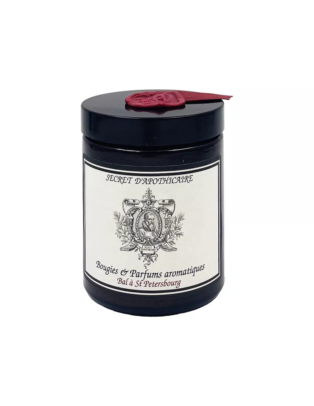 La bougie parfumée Bal à St Petersbourg fait partie de la collection « Apothicaire ». Le pommadier est revêtu de son cachet de cire et de son ruban de couleur rouge foncé.