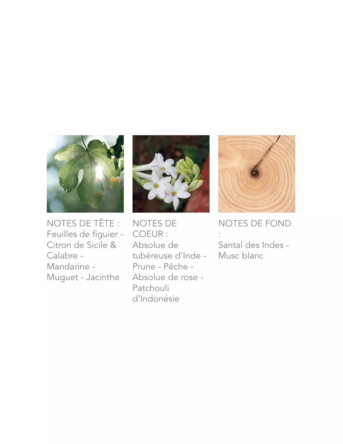 Senteur de tête : feuilles de figuier de Provence, citron de Sicile & Calabre, mandarine, muguet, jacinthe
