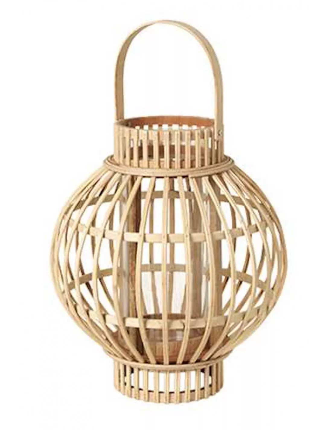 Lanterne en Bambou avec une anse pour décorer vos extérieurs, terrasses et piscine. Elle est livrée avec une verrerie pour y placer un cierge pour illuminer vos soirées.