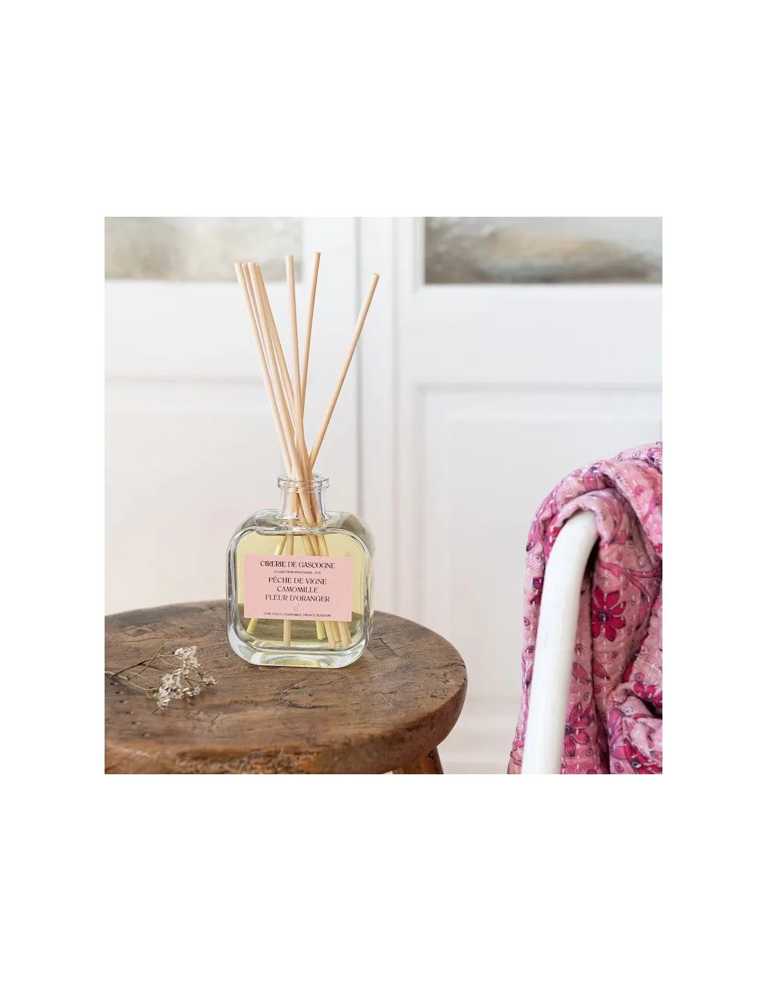 Ce diffuseur à bâtonnets se présente dans un flacon élégant accompagné d’un étui assorti, idéal pour offrir ou décorer votre maison. Sa composition olfactive unique mêle la gourmandise fruitée de la pêche de vigne à la douceur apaisante de la camomille et de la fleur d’oranger, créant un bouquet fraîchement fleuri.