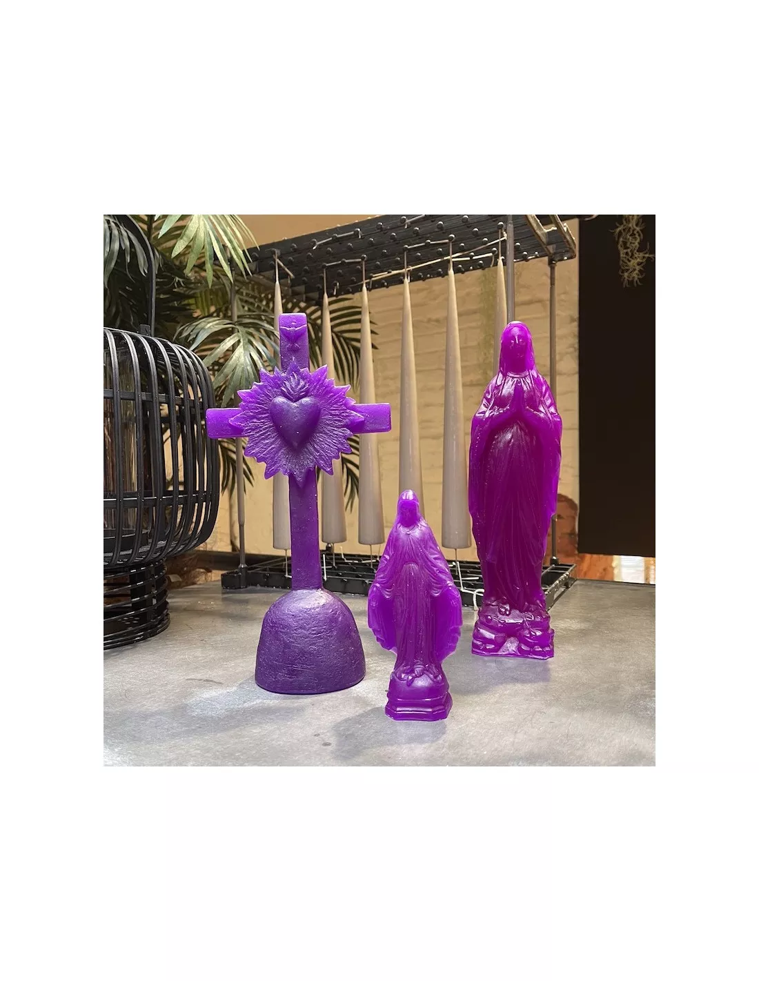 Toutes ces madones et vierges en cire sont réalisées à la main, elles sont donc des pièces uniques. Elles n’ont pas de mèche et ne sont donc pas des bougies.