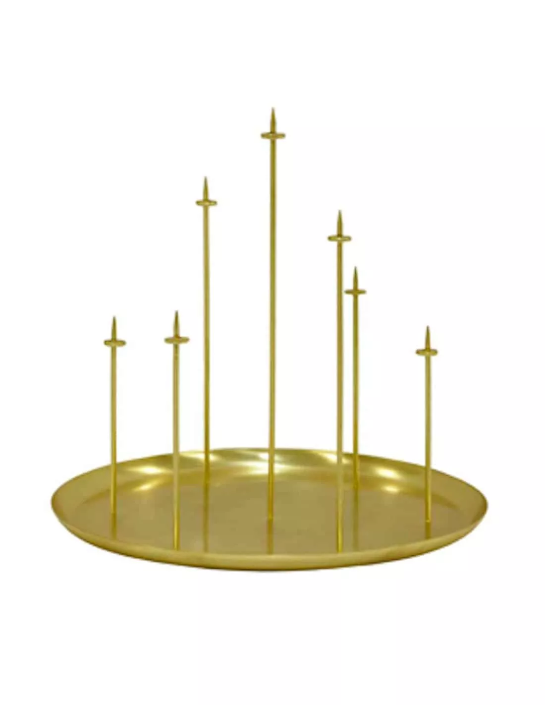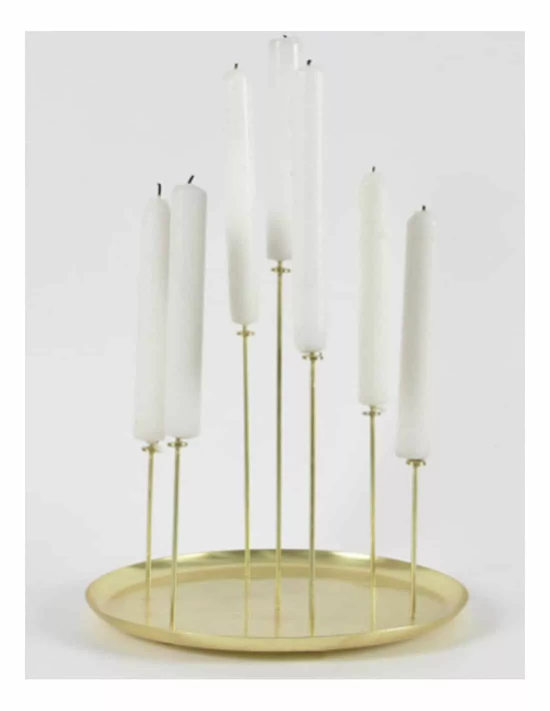 Ce bougeoir se distingue par sa structure multi-tiges en acier doux doré, offrant un équilibre parfait entre la finesse de ses lignes et sa présence visuelle. Sa finition dorée éclatante capte la lumière de vos bougies pour créer une atmosphère chaleureuse et raffinée sur une table de fête ou une console.