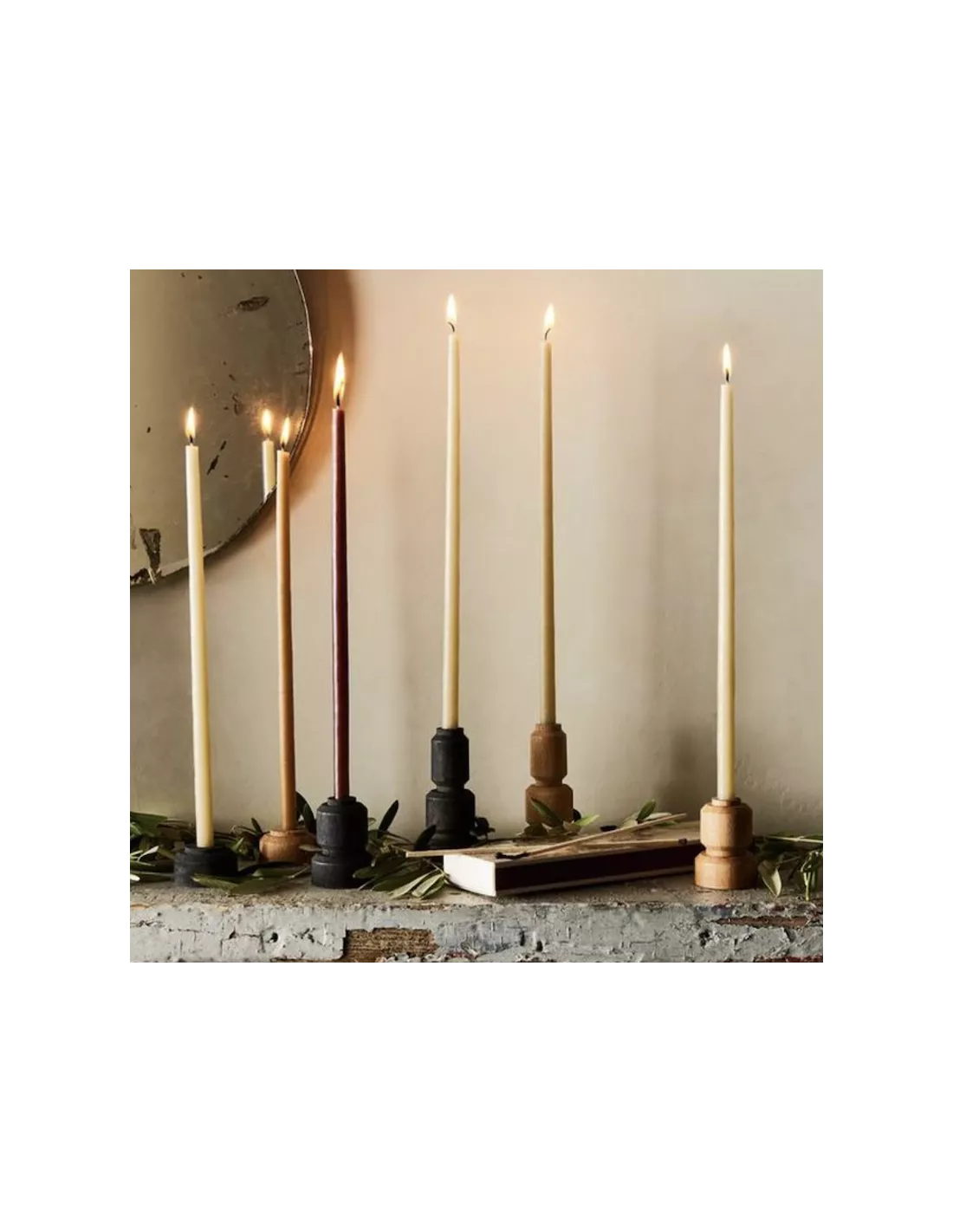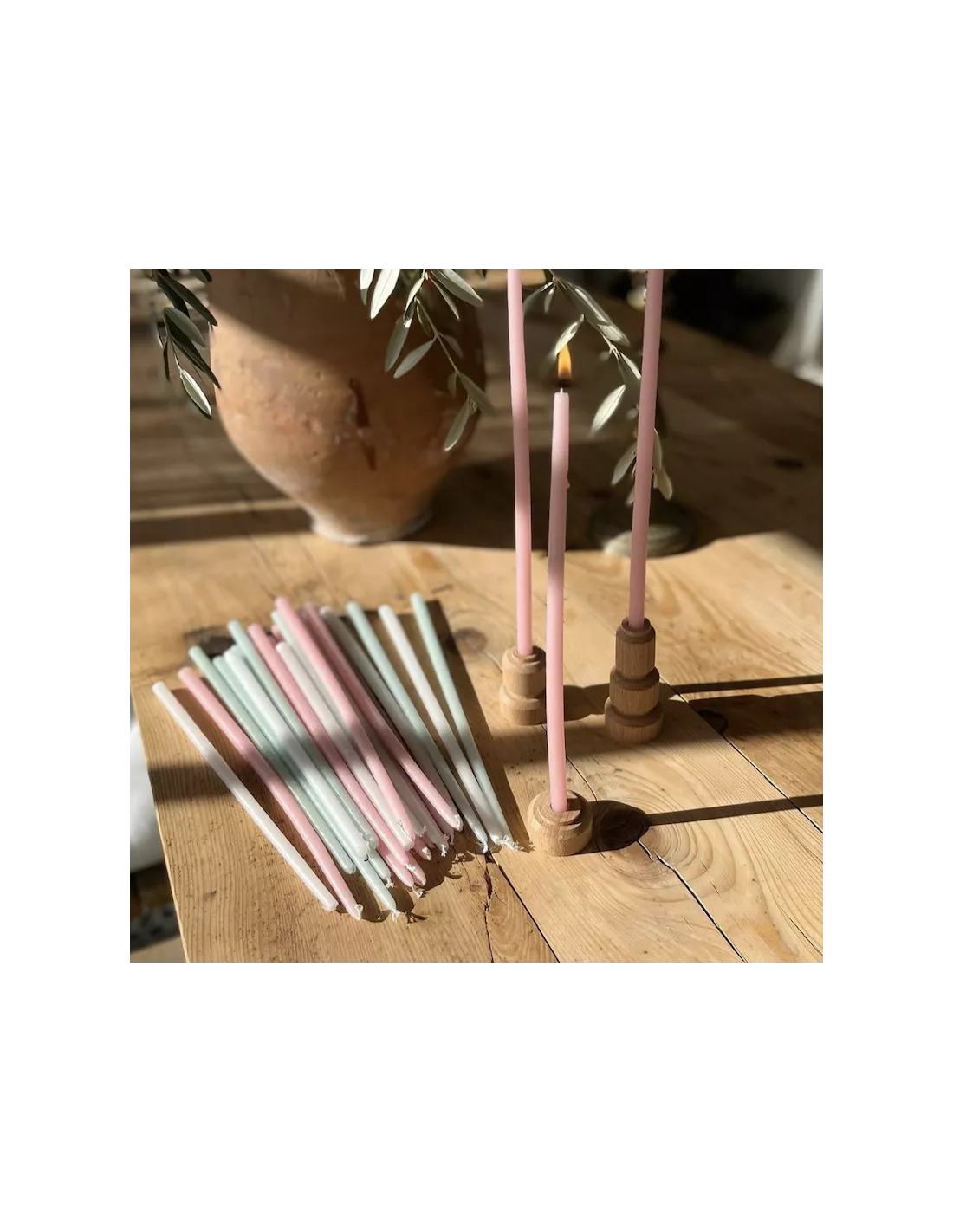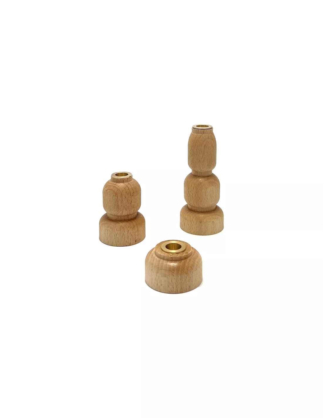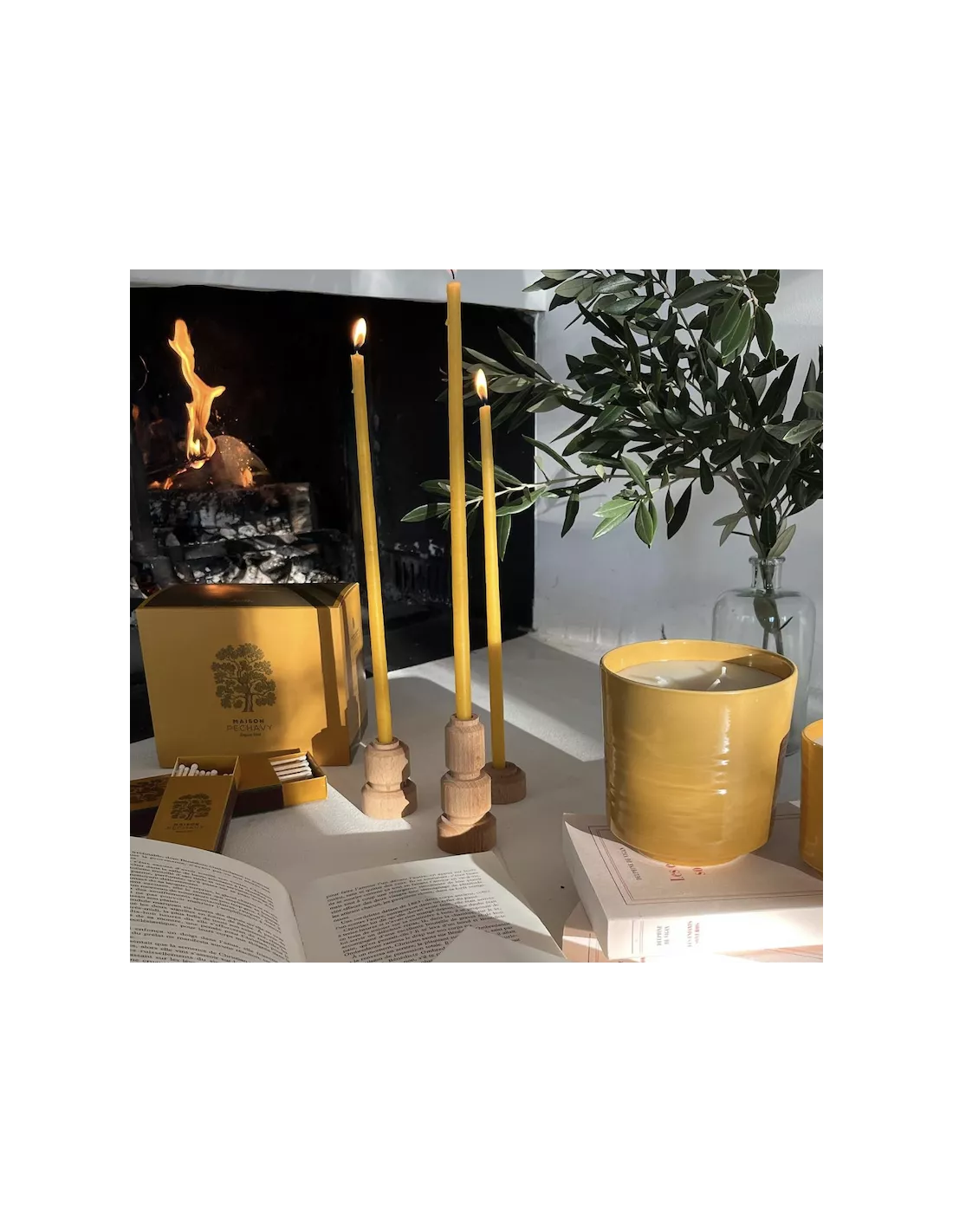 Chaque bougeoir est tourné avec précision dans du bois de hêtre massif issu des forêts du Cantal. La texture naturelle et claire du bois offre un contraste visuel saisissant avec l’insert en laiton brossé. Ce détail en laiton n’est pas seulement esthétique : il sert de réceptacle protecteur, isolant le bois de la chaleur de la flamme de vos chandelles.