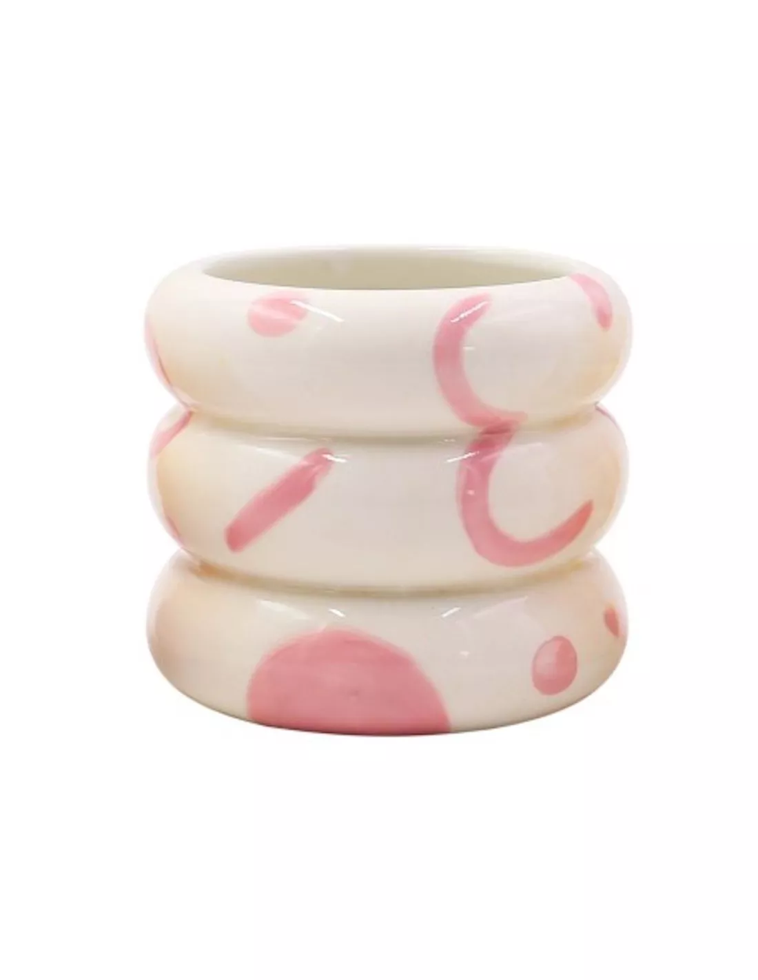 Ce petit vase artisanal en dolomite se distingue par son alliance chromatique douce de rose et de blanc, sublimée par un fini émaillé brillant. Chaque motif est appliqué au pinceau avec soin, reflétant le savoir-faire belge et l’esprit ensoleillé caractéristique de la marque. Idéal pour accueillir une petite plante grasse ou comme objet décoratif sur une étagère, ce pot est une pièce unique qui invite à la bonne humeur.