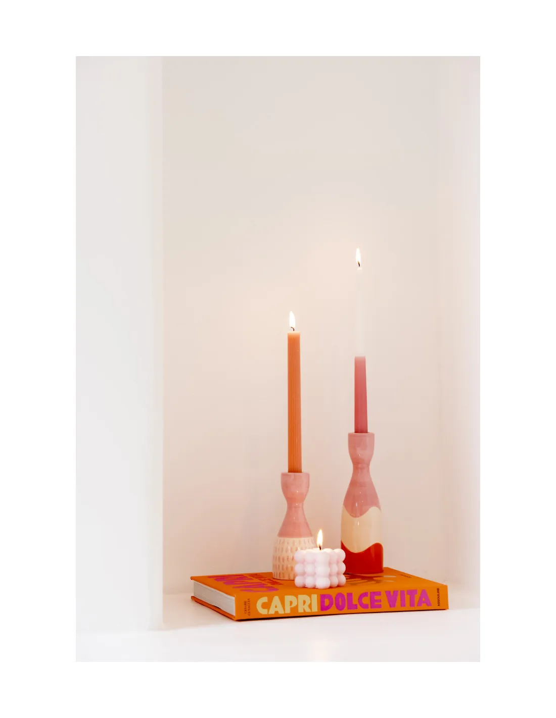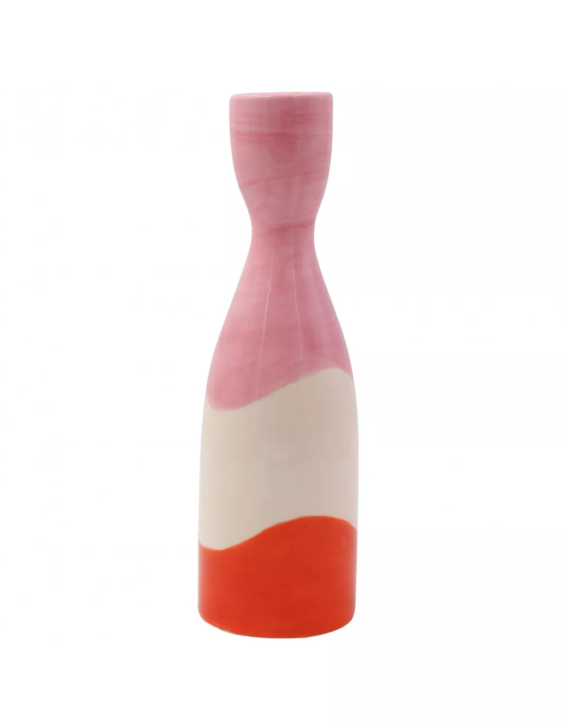 Le bougeoir Nina se distingue par sa silhouette élancée et son motif anthropomorphique unique, arborant un visage stylisé qui capture l’essence ludique du style Que Rico. Sa structure en dolomite est habillée d’un dégradé vibrant de rose et de rayures orange éclatantes, contrastant avec des touches de blanc pur. Chaque pièce étant peinte à la main, les nuances et les coups de pinceau rendent votre exemplaire absolument unique.