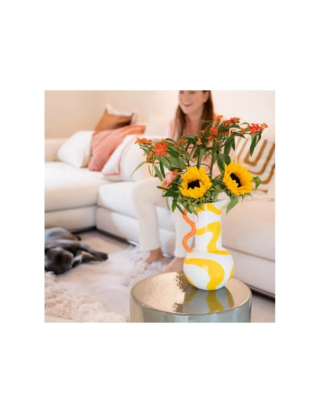 Véritable pièce d’artisanat, cette cruche en dolomite transcende sa fonction utilitaire pour devenir un objet de décoration central. Arborant le motif exclusif ‘Spanish Swirls’, elle se pare de courbes dynamiques peintes à la main où le jaune éclatant rencontre la pureté du blanc. Chaque pièce, issue du savoir-faire belge et d’une fabrication méticuleuse, possède des nuances uniques qui lui sont propres.