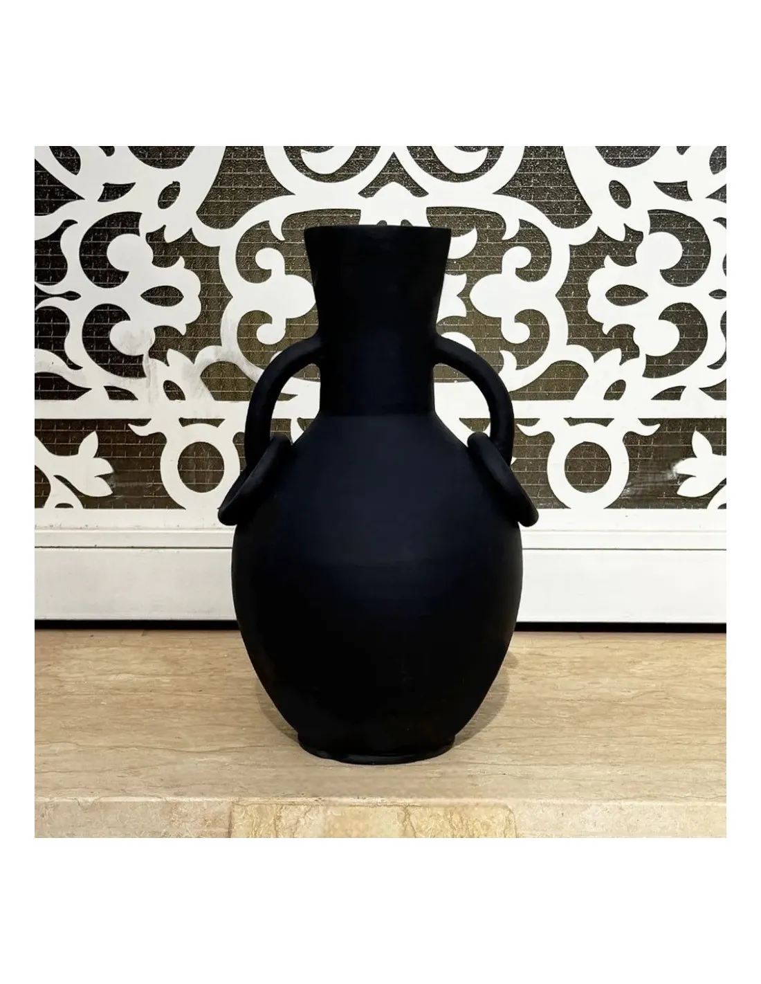 Le modèle Cirta se distingue par sa silhouette sculpturale de 39 cm et son fini charbon profond qui capture la lumière de manière subtile. La texture brute de la terre cuite offre un contraste saisissant avec les lignes épurées de sa forme minimaliste, rendant chaque pièce totalement unique.